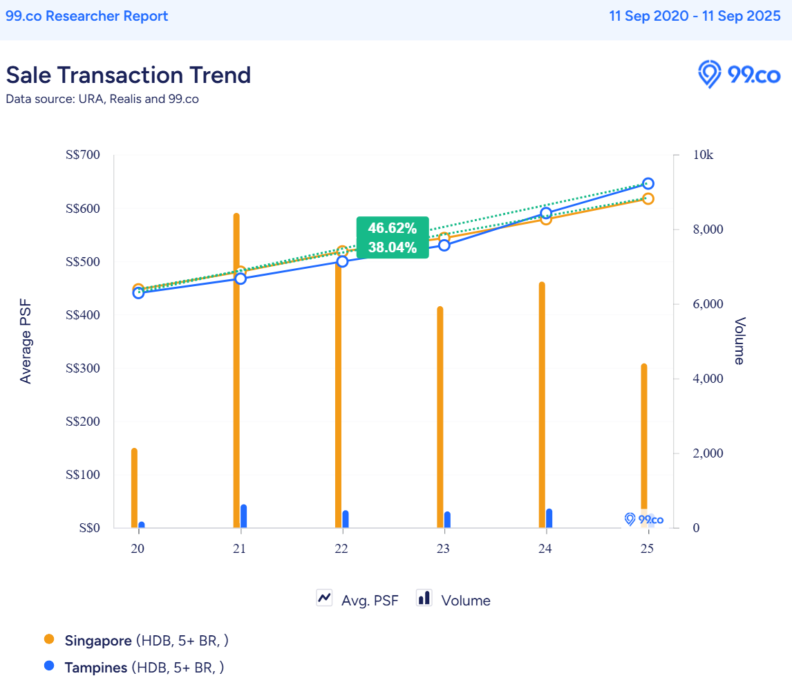 The PSF development for 5-room and bigger flats in Tampines has strengthened markedly over the previous 5 years. Between 2020 and 2025, Tampines’ common PSF for these flats rose by roughly 46.62%, outpacing the nationwide achieve of round 38% for similar-sized items.