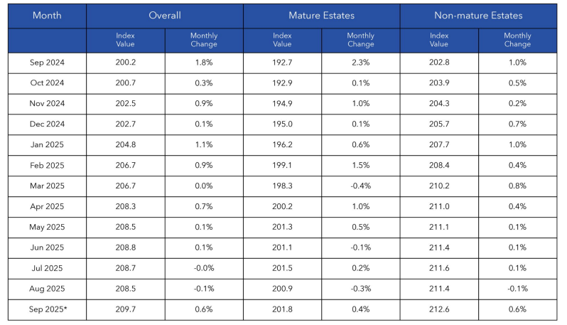 Each Mature and Non-Mature estates recorded worth positive aspects, rising 0.4% and 0.6%, respectively, since August. By room sort, Government flats led with a 1.4% month-to-month achieve, reflecting larger demand from multi-generational households. 4-room and 5-room flats additionally superior by 0.6%, whereas 3-room flats slipped 0.9%, suggesting smaller models could also be feeling the pinch from cautious first-time patrons affected by financing limits.