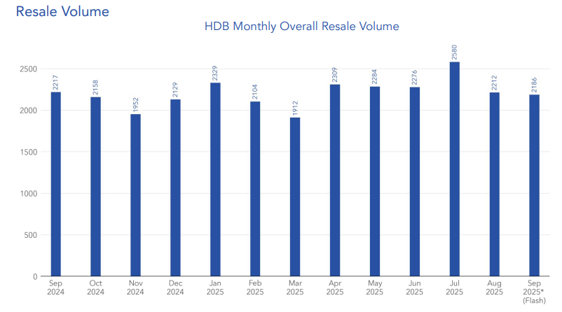 In September, 2,186 resale flats have been transacted — a modest 1.2% drop from August and 1.4% under September 2024. Whereas this implies a gentle slowdown, the general quantity stays wholesome for a historically quieter interval following the Hungry Ghost Month.
